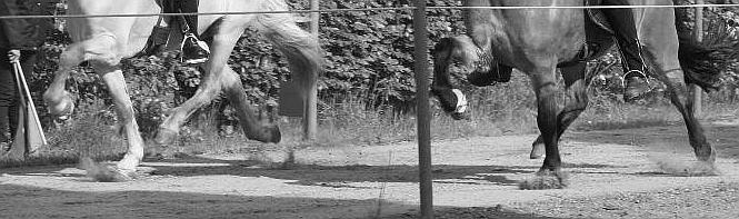 Hier zijn twee paarden in telgang. Bij beide paarden is er één voorbeen op de grond.