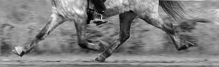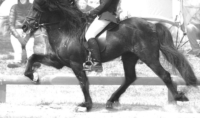 Unipedale fase in tölt bij een zwarte IJslandse hengst. Duidelijk is te zien dat alleen zijn linkervoorbeen op de grond staat. Zijn rechterachterbeen is bijna op de grond. Na deze unipedale fase komt dus de diagonale fase. Kunt u deze fases vinden op het schema? (antwoord staat onderaan de pagina)